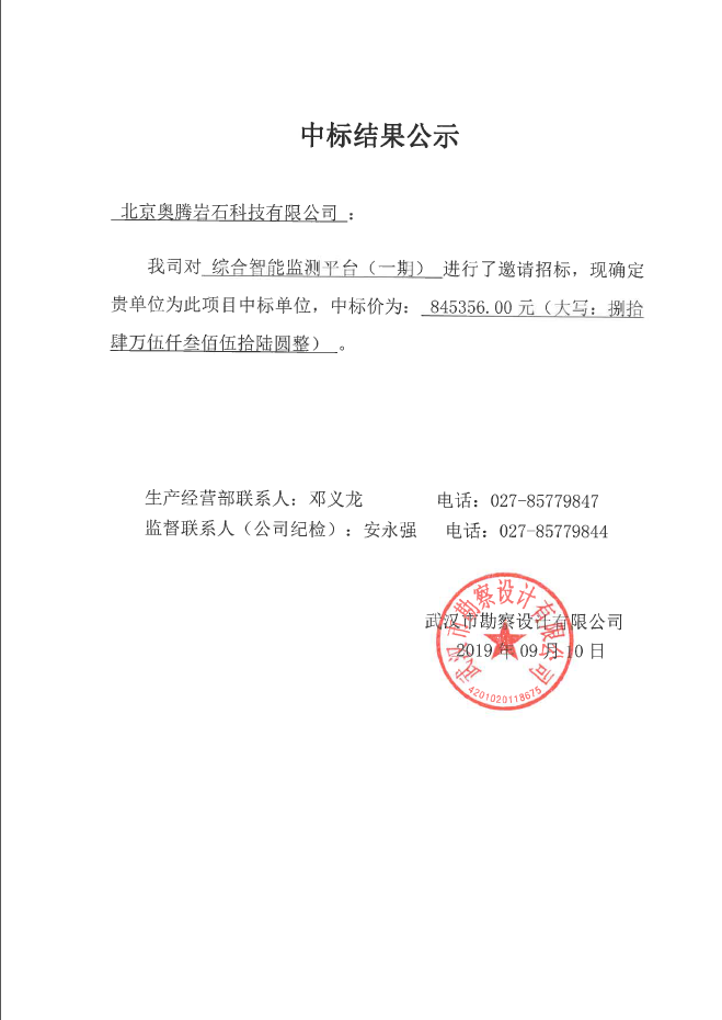 武漢市勘察設計有限公司綜合智能監(jiān)測平臺(一期)中標結果公示