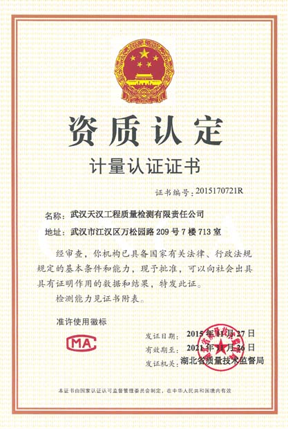 資質(zhì)認(rèn)定計(jì)量認(rèn)證證書