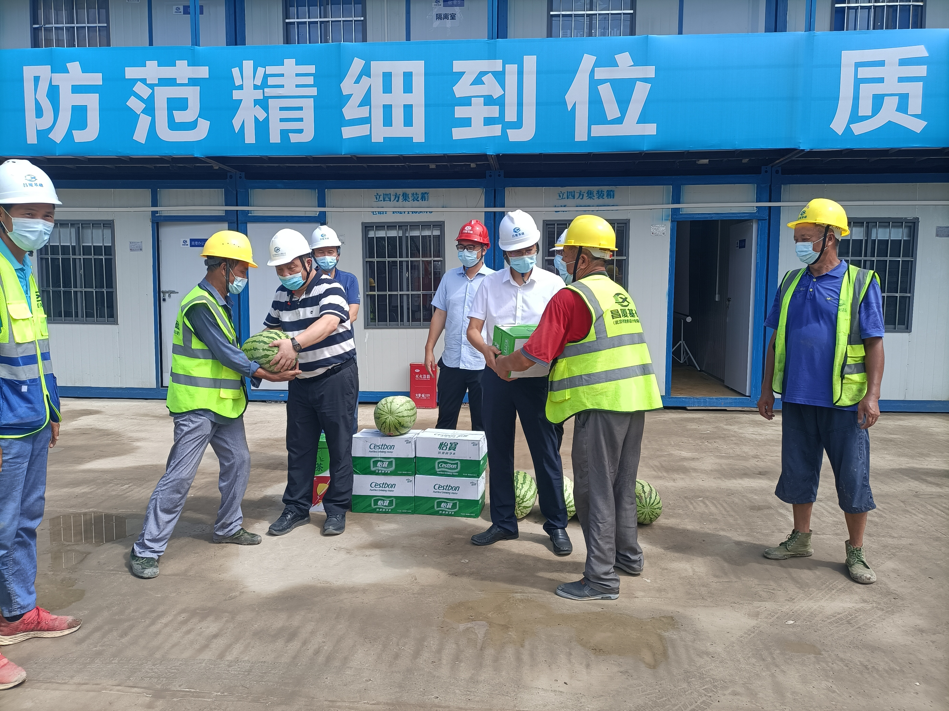 同時(shí),公司領(lǐng)導(dǎo)在項(xiàng)目現(xiàn)場開展了送清涼活動,為一線人員送上礦泉水、西瓜、花露水、藿香正氣水等防暑降溫物資及個人防護(hù)用品,并叮囑在高溫堅(jiān)守崗位的一線職工要注意勞逸結(jié)合,做好疫情個人防護(hù),消除各類安全隱患,確保夏季安全生產(chǎn)。(綜合部(黨群工作部)